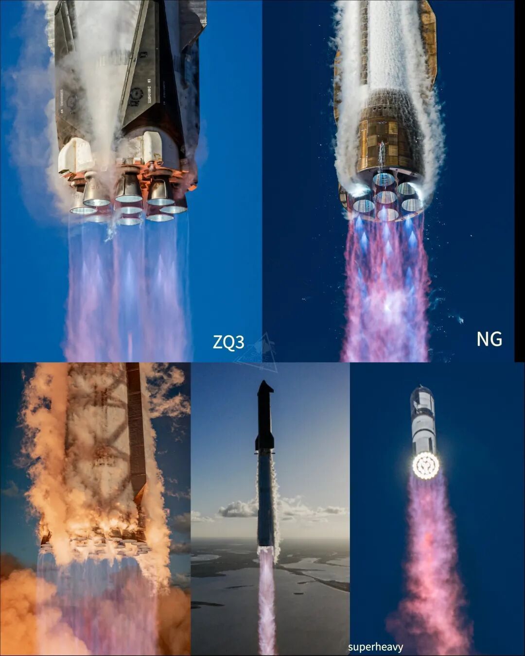 朱雀三号(左上)、新格伦(右上)和星舰的超重型助推器(下),都使用了液氧甲烷推进剂